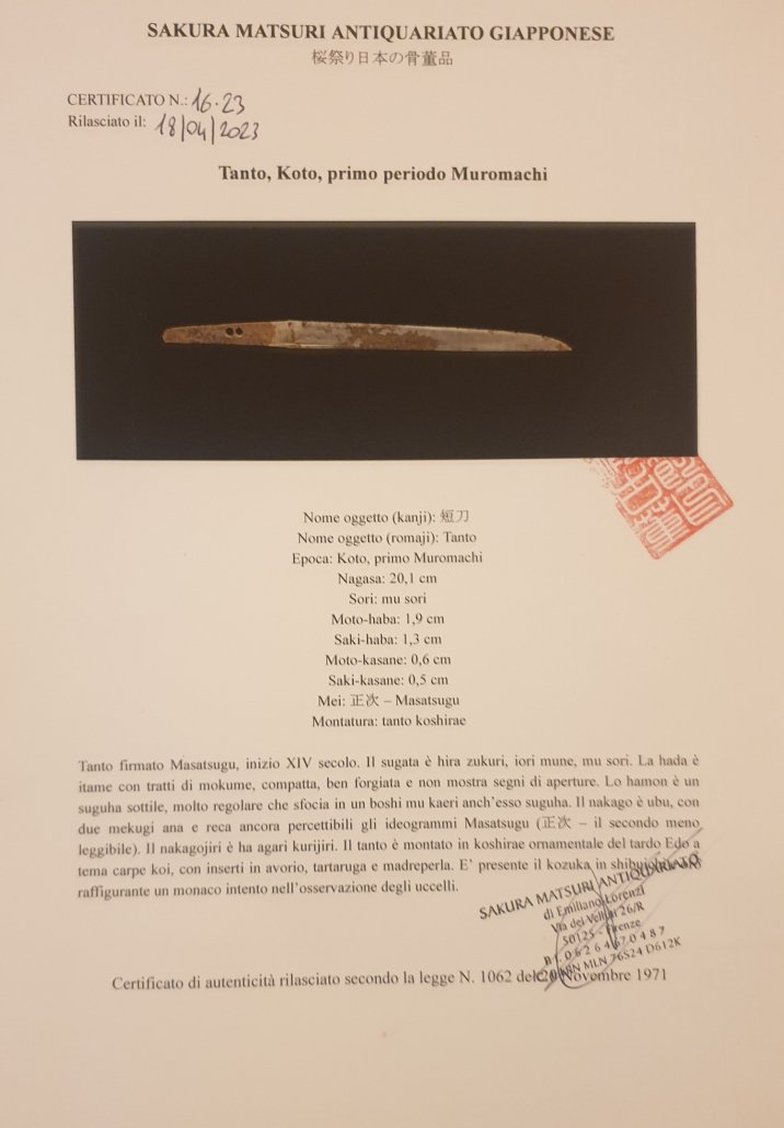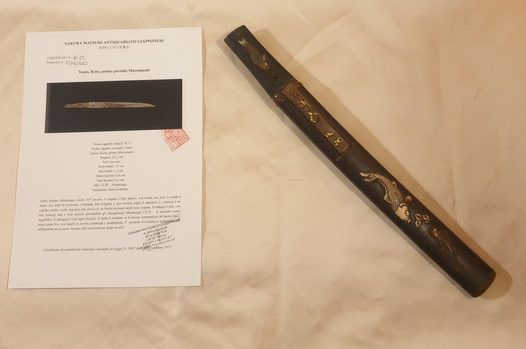 Antica Tanto: arma bianca giapponese sia posseduta della casta guerriera, sia dalle donne dei Samurai. Nota in occidente per essere il pugnale del rituale del suicidio nel testimoniare l’Anima pura rispetto alla sopraffazione e al disonore. Nella Madama Butterfly, opera di Giacomo Puccini, è l’arma utilizzata dalla protagonista, nel rito di immolazione.