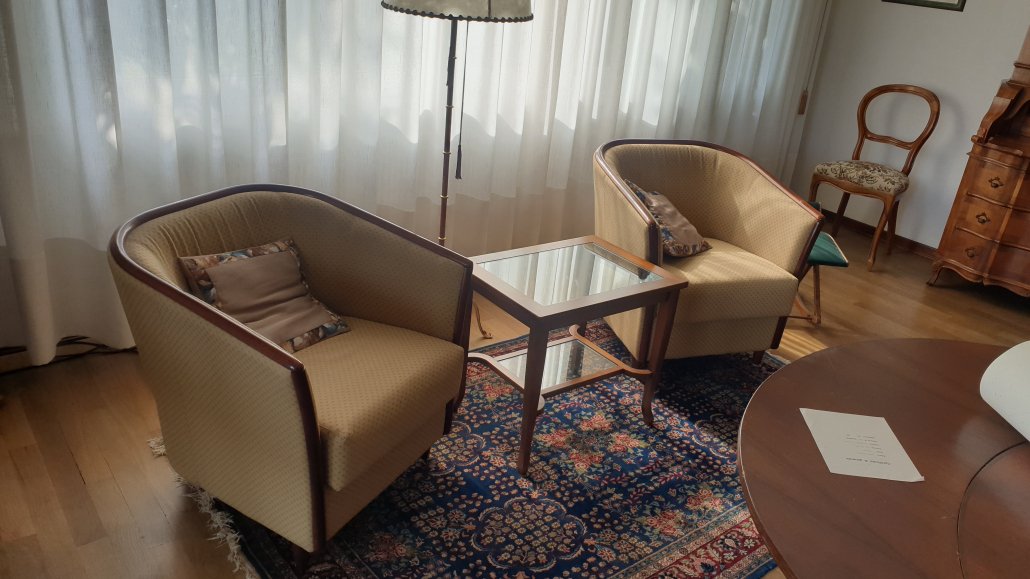 L’articolazione architettonica di questa villa degli Anni Settanta del Novecento, in un contesto di alta qualità residenziale a Cervignano, offre nell’arredo d’interni una sapiente armonia d’insieme, anche con il gusto, la cultura eclettica tra antico e moderno, tipica di cinquant’anni fa e testimonia, quindi, un valore storico artistico e documentario indubbio, tale da poter essere tutelato e preservato ancora nel tempo. Allo smaterializzarsi progessivo e veloce della casa d’abitazione contemporanea, questa residenza è di gusto borghese e colto in cui l’arredo collocato con strutture fisse e varia mobilia, mantiene un carattere sobrio e funzionale: dopo mezzo secolo non stanca, anzi, disegna una atmosfera di spazi ariosi con disposizione di mobilia molto confortevole.