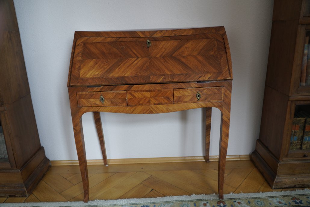 Tavolino scrivania in noce con cassetto, gamba mossa, stessa epoca. M27 € 1400.oo