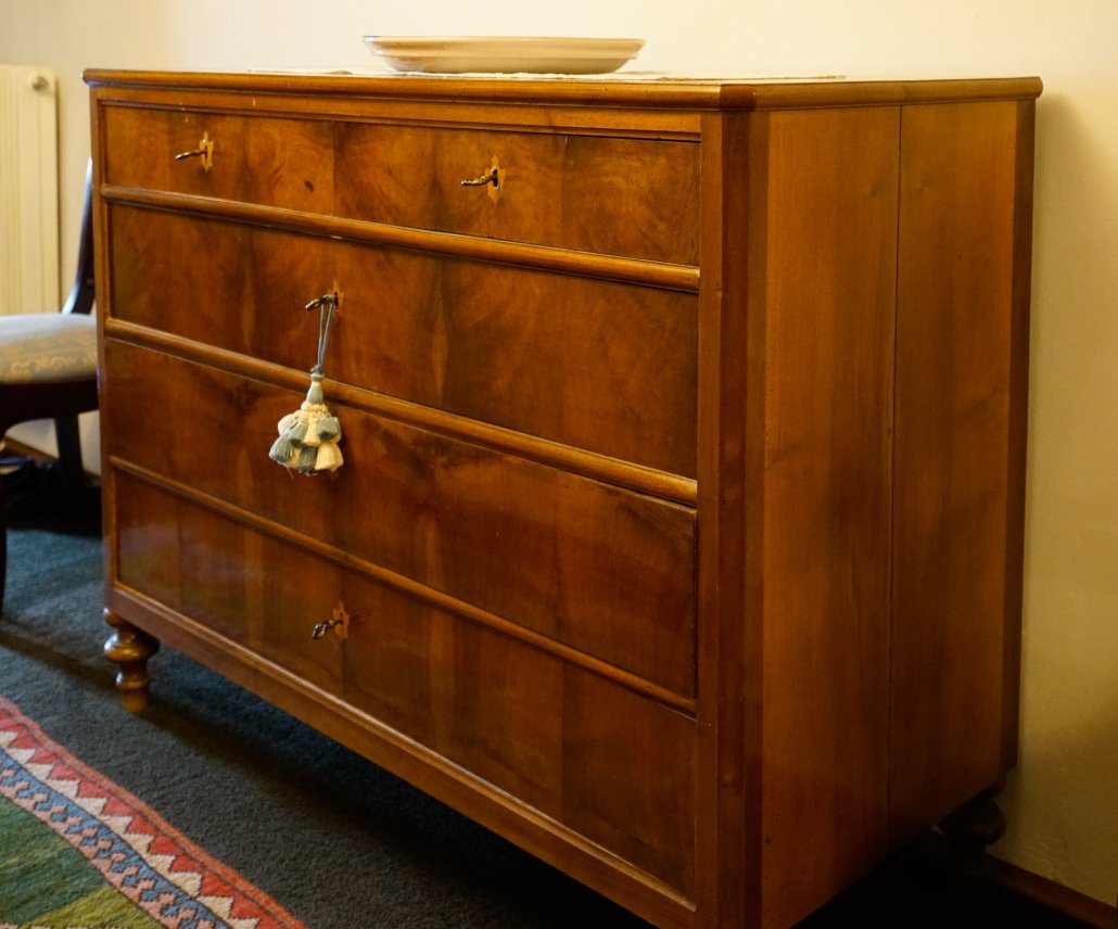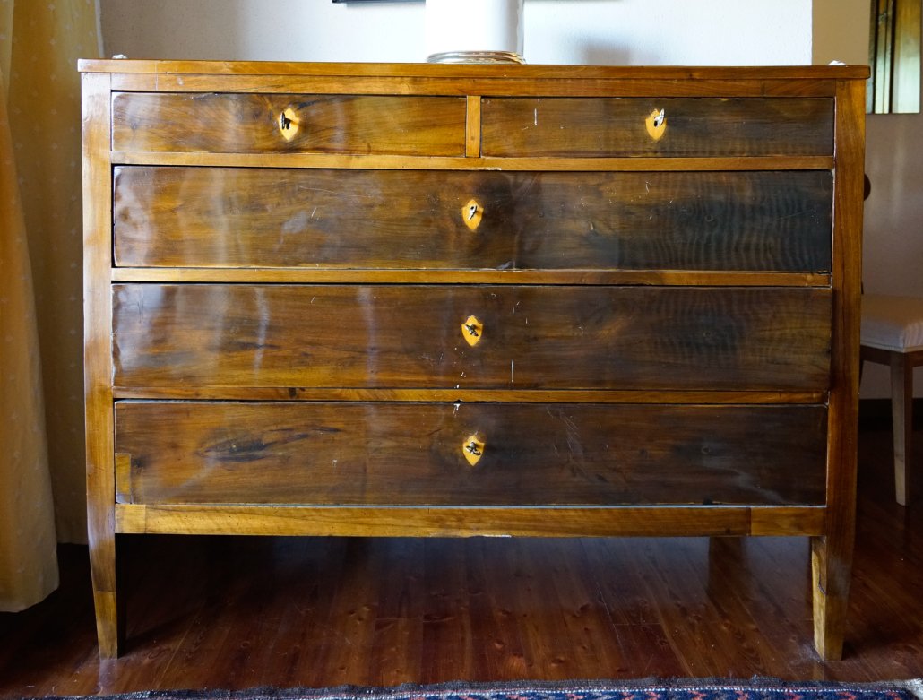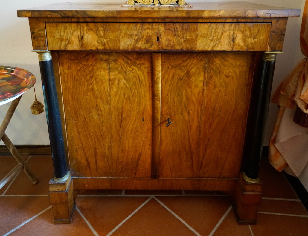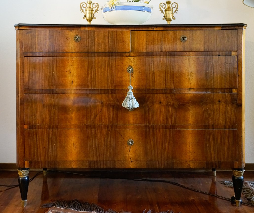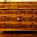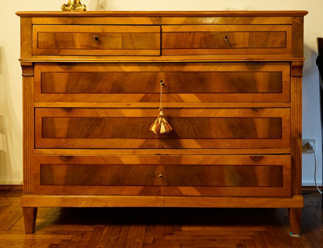 Comò austriaco in noce e intarsiato con lesene neoclassiche.