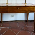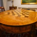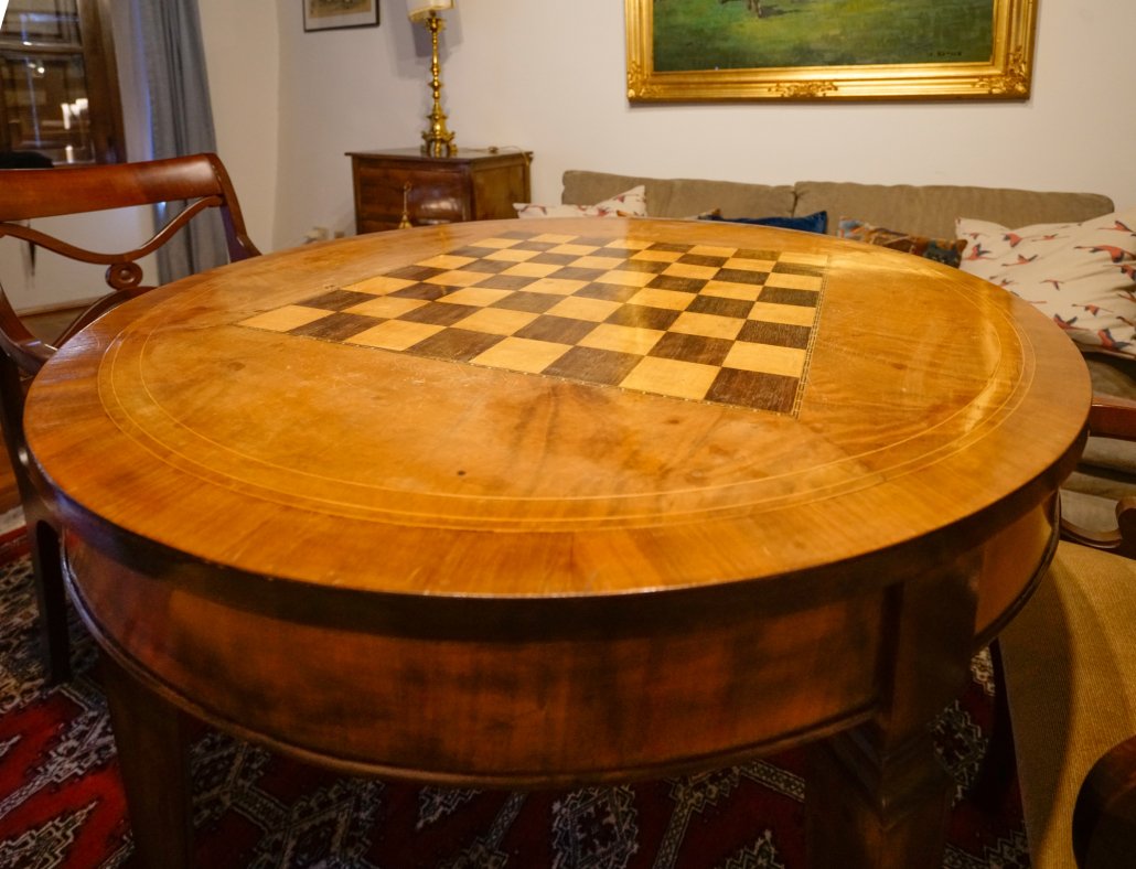 Tavolino grande a quattro gambe, in noce con scacchiera in piano.