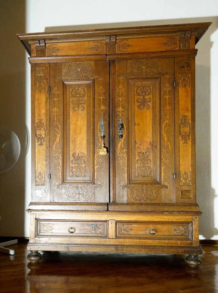 Grande Armadio architettura a due ante e due cassetti, festonato a intarsi,