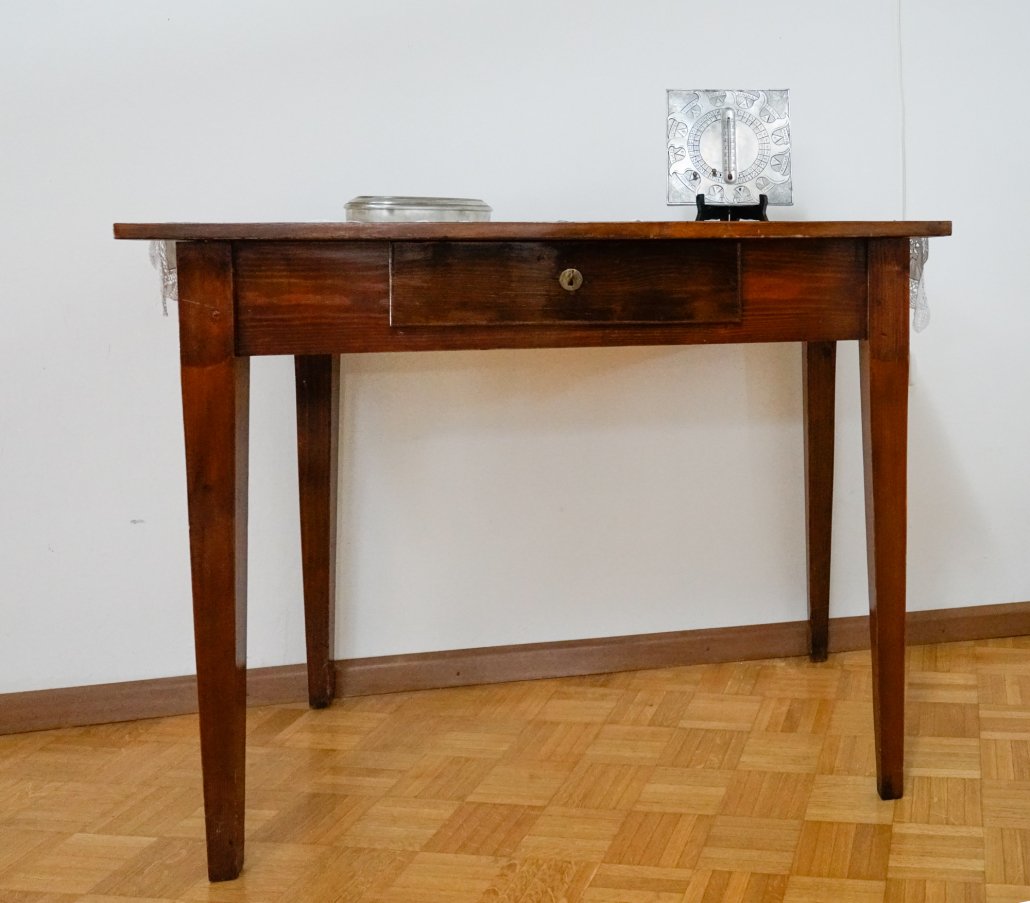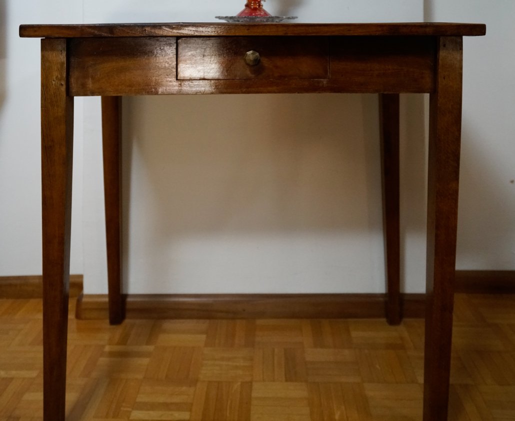 Tavolo dell’Ottocento in noce con cassetto, gamba a tronco di piramide