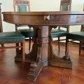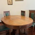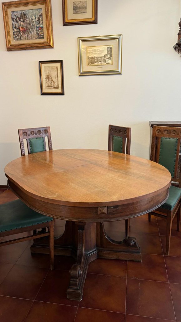 Tavolo ovale in noce, apribile per prolunga (assente), gamba centrale decorata con volute e ben sagomata.